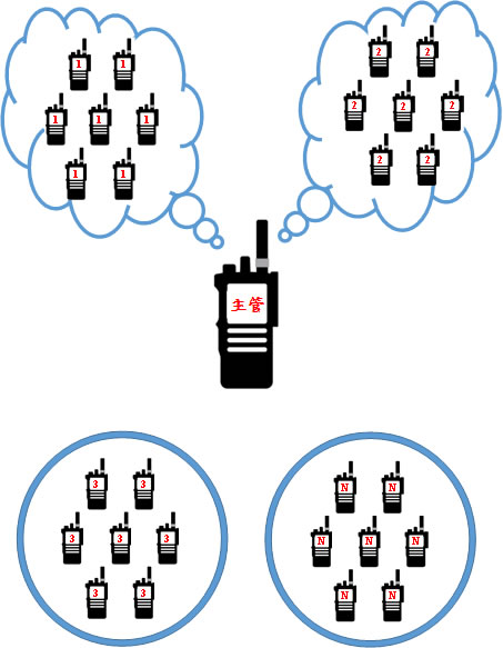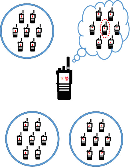 主管想對全體人員進行廣播,此時開啟「群呼」功能即可對全體人員廣播,接受廣播者不論在哪個頻道(不用轉頻道)皆可收到主管的訊息。 |