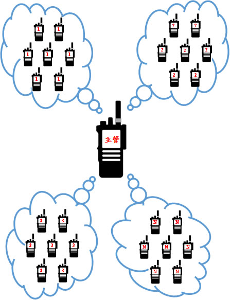 群呼: 主管可隨時對任全體人員通話(不論人員所在頻道為何)