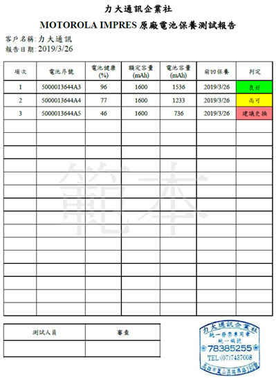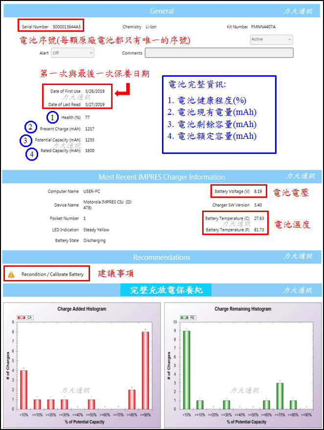 力大通訊是MOTORORA原廠的授權經銷商,我們有完整的原廠IMPRES智能設備,可幫客戶進行原廠IMPRES電池的保養及分析,透過IMPRES的智能科技可以得到完整的電池資訊如下圖2,另外可提供電池保養報告給您,如圖3。