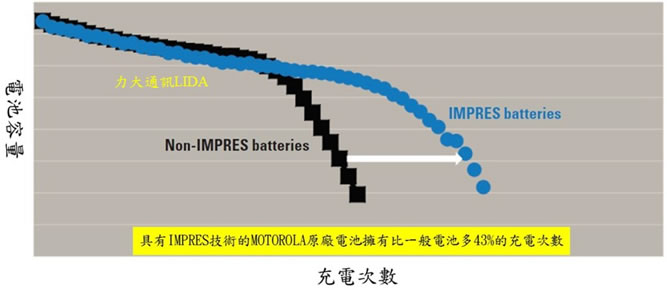 IMPRES智能型充電系統是一種新型的充電系統,其擁有自動化的電池維護功能和提升電池重複充電的次數(如圖1),亦可透過IMPRES原廠充電座得知電池的資訊,進一步掌握電池得狀態,讓通訊不會因此間斷。IMPRES原廠充電座具有保護機制,當電池充飽後不會再繼續充電讓電池溫度過高導致發生危險,因此當我們電池充飽後,可以放心的將電池放在原廠充電座中而不需特別照顧。