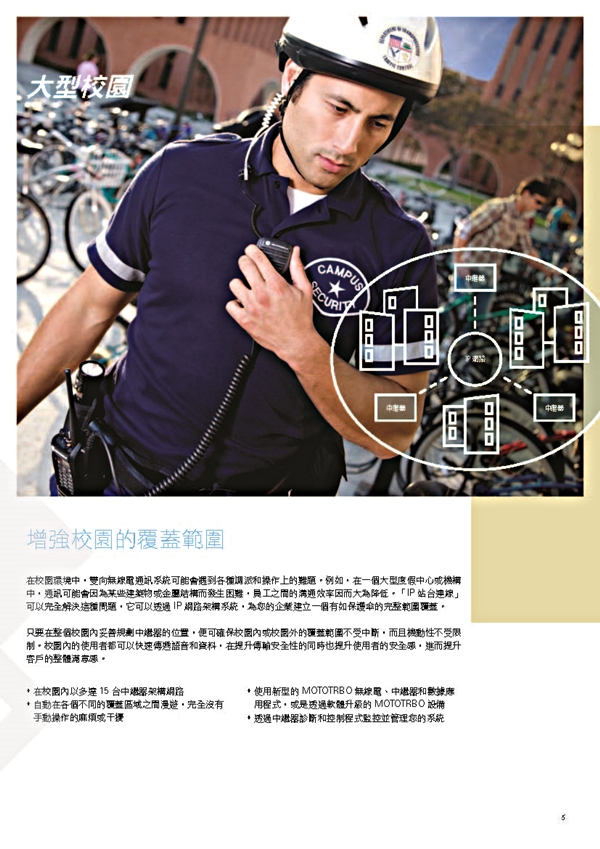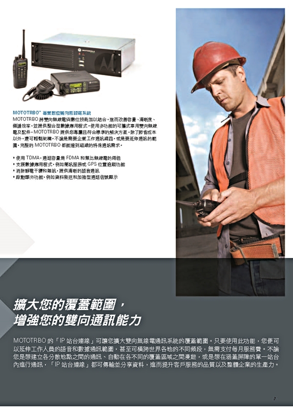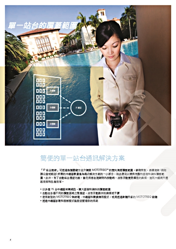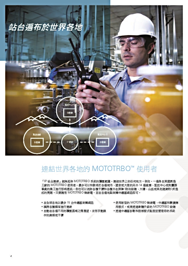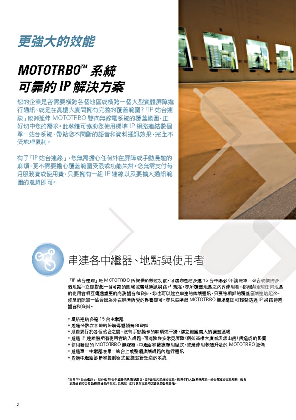 IP Site Connect數字解決方案使用Internet擴展您的MOTOTRBO通信系統的 覆蓋範圍,無論您位於何處。您可以在城市,州或國家的地理位置分散的位置之間 輕鬆交流。 您可以創建廣域覆蓋,並自動漫游從一個覆蓋區域到另一個覆蓋區域。 或者,您可以在一個多障礙的高層建築增強覆蓋用多站台解決死角問題。 IP Site Connect使您能夠擴展員工的語音和數據通信能力,超越傳統無線電 無法達到的功能這意味著大幅改善客戶服務和提高生產力。